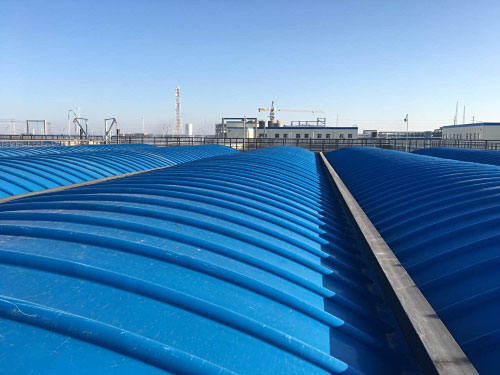 封闭系统:抗腐蚀、抗老化玻璃钢盖板+阳光板不锈钢骨架封闭。